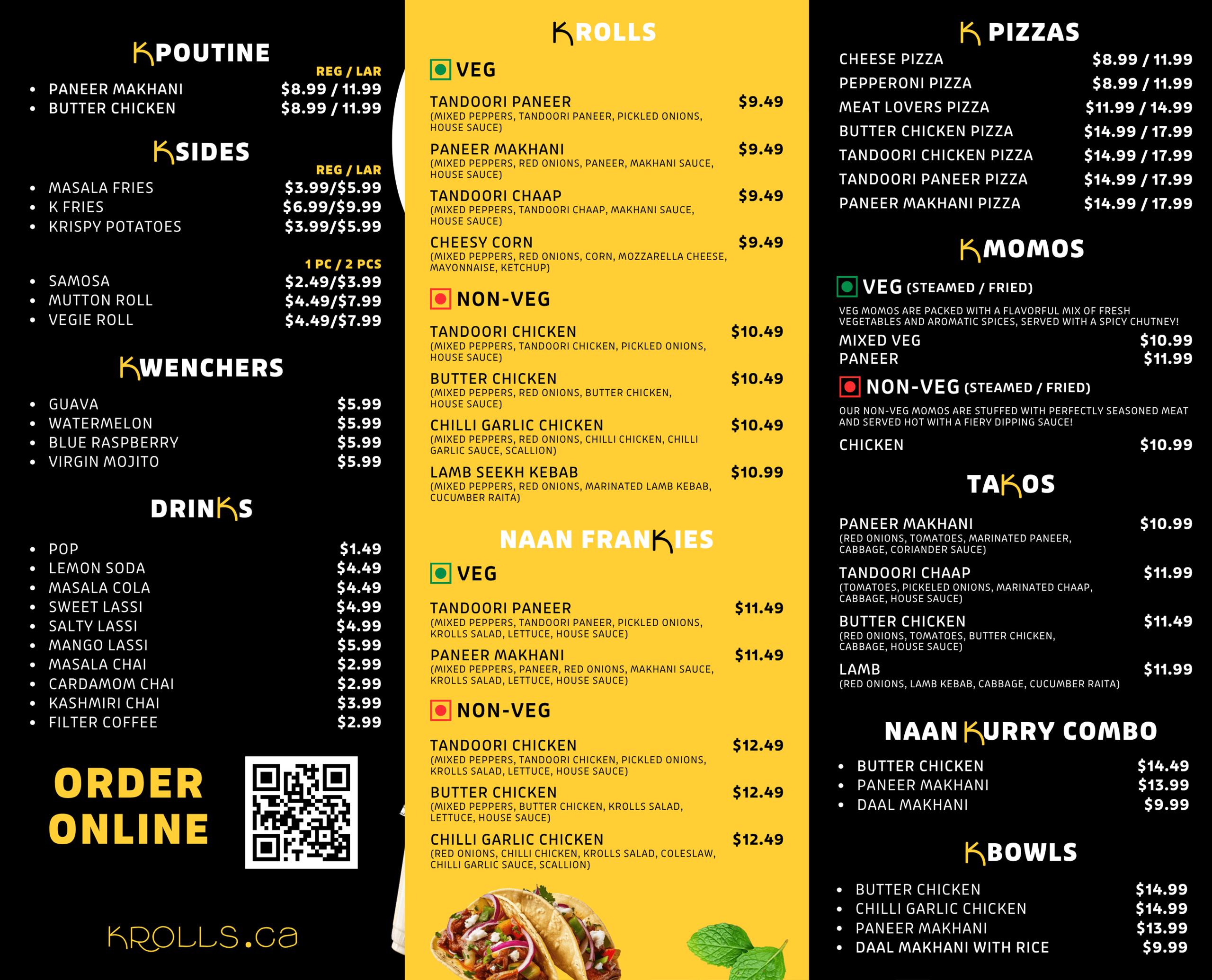 Where flavor takes the center stage! Explore our diverse menu featuring mouthwatering Kathi Rolls, delectable Frankies, irresistible Tacos, indulgent Poutine, and flavorful Naan Curry Combos, along with a wide array of other tempting options. Experience a culinary journey at KROLLS!